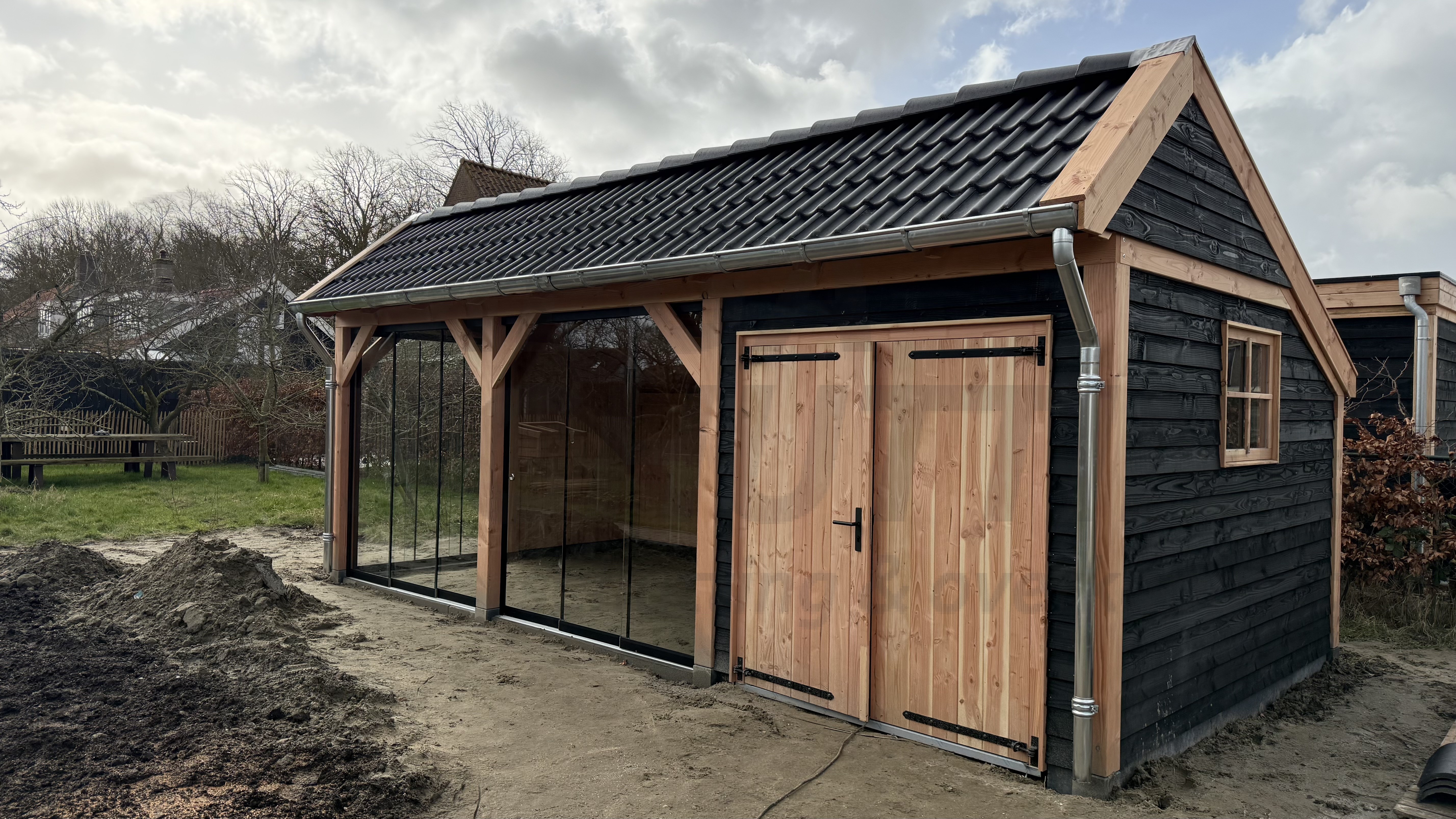 Een andere variant zijn volledig houten schuttingen. Deze hebben houten palen met houten schermen ertussen.